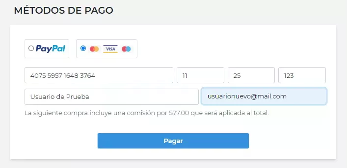 Si elige pagar con tarjeta de crédito o débito. Solo debe dar click en el botón con las diferentes tarjetas y llenar el formulario.