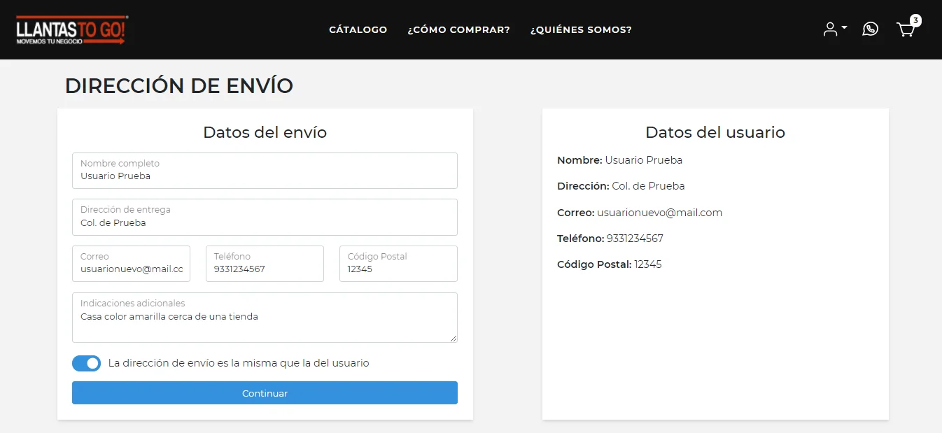 Si la dirección de envío es la misma que el usuario, deberá presionar el botón switch y clic en "Guardar y continuar".