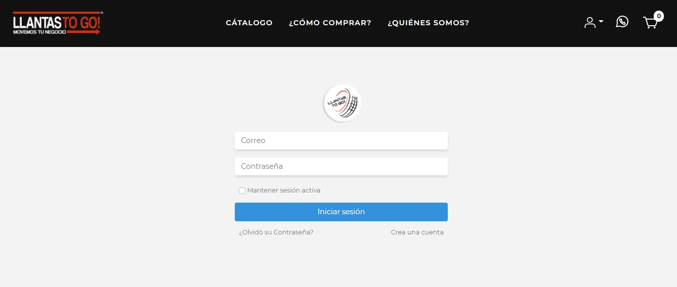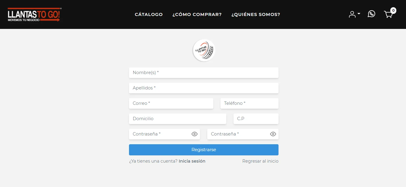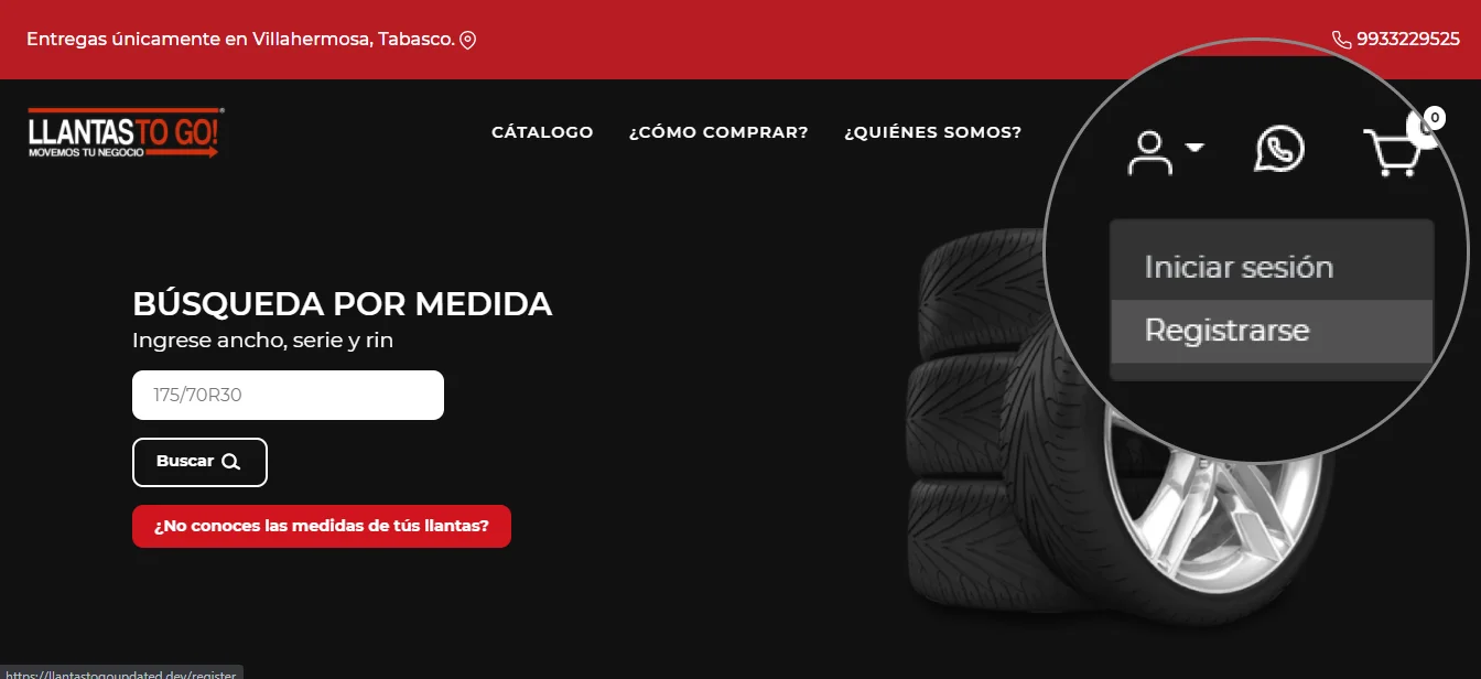 Si desea crear una cuenta para relizar compras en Llantas to Go, solo debe dirigirse al botón azul con el icono de usuario, para desplegar las opciones. Seguido de esto, deberá hacer clic en el botón "Registrarse".