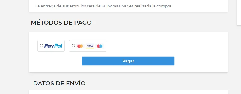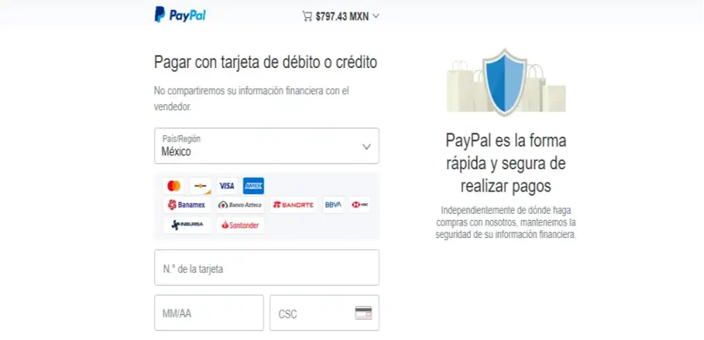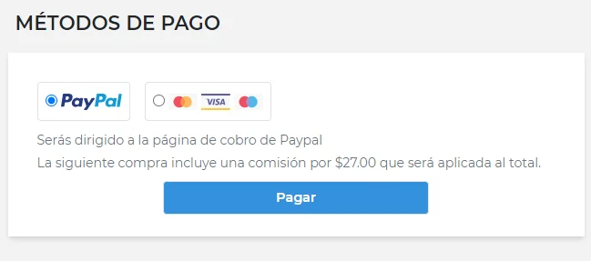 Si elige pagar con paypal. Solo debes seleccionarl el logo de Paypal para posteriormente hacer click en el botón pagar y serás dirigido al panel de cobro con Paypal.